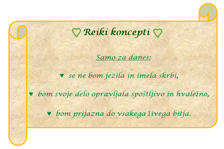 In tako ima tudi Reiki svoja srčna načela, ki nam Reikistom pomagajo ohranjati zavedanje, da je vsak dan poln neštetih možnosti, kjer smo na poligonu preizkušanja lastnih mej, potrpežljivosti in vpliva zloglasnega gospoda Ega.
